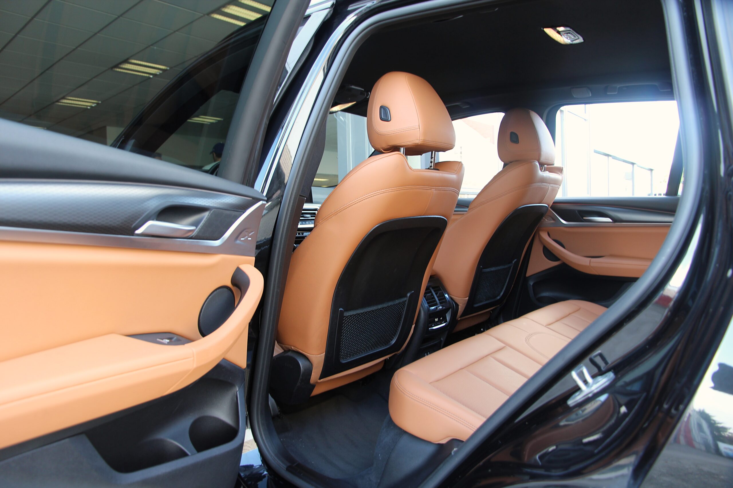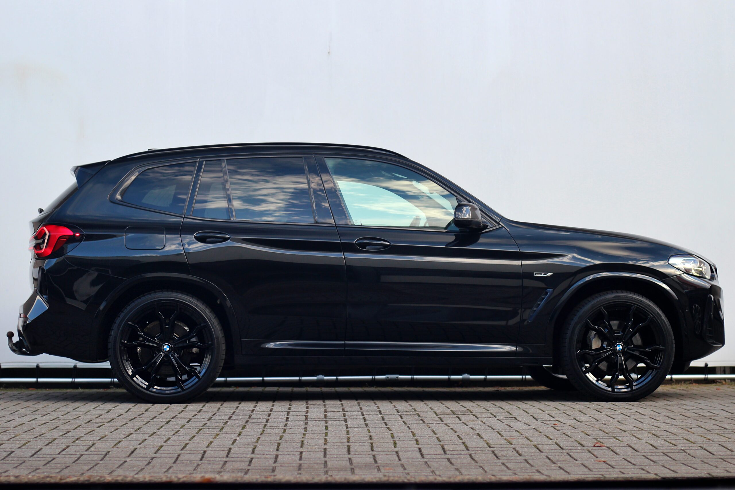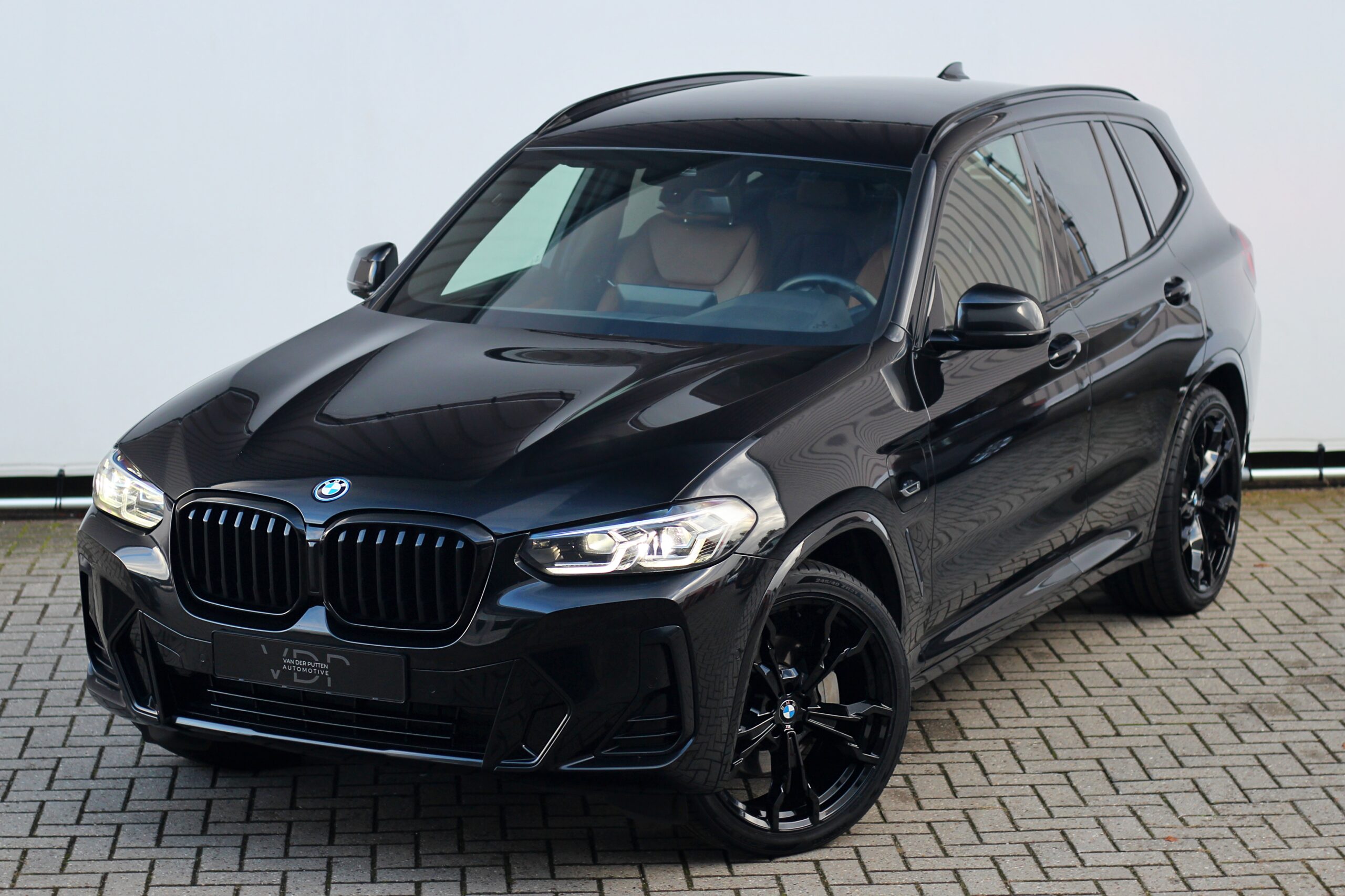 De BMW X3 is uitgevoerd in de kleur “Black Sapphire Metallic” in combinatie met een volledig zwart exterieur als gevolg van het Shadow Line pakket inclusief zwarte ‘nieren’ en zwarte uitlaat sierstukken. De zwarte 21 inch M-Sport velgen maken de look van deze BMW helemaal af.